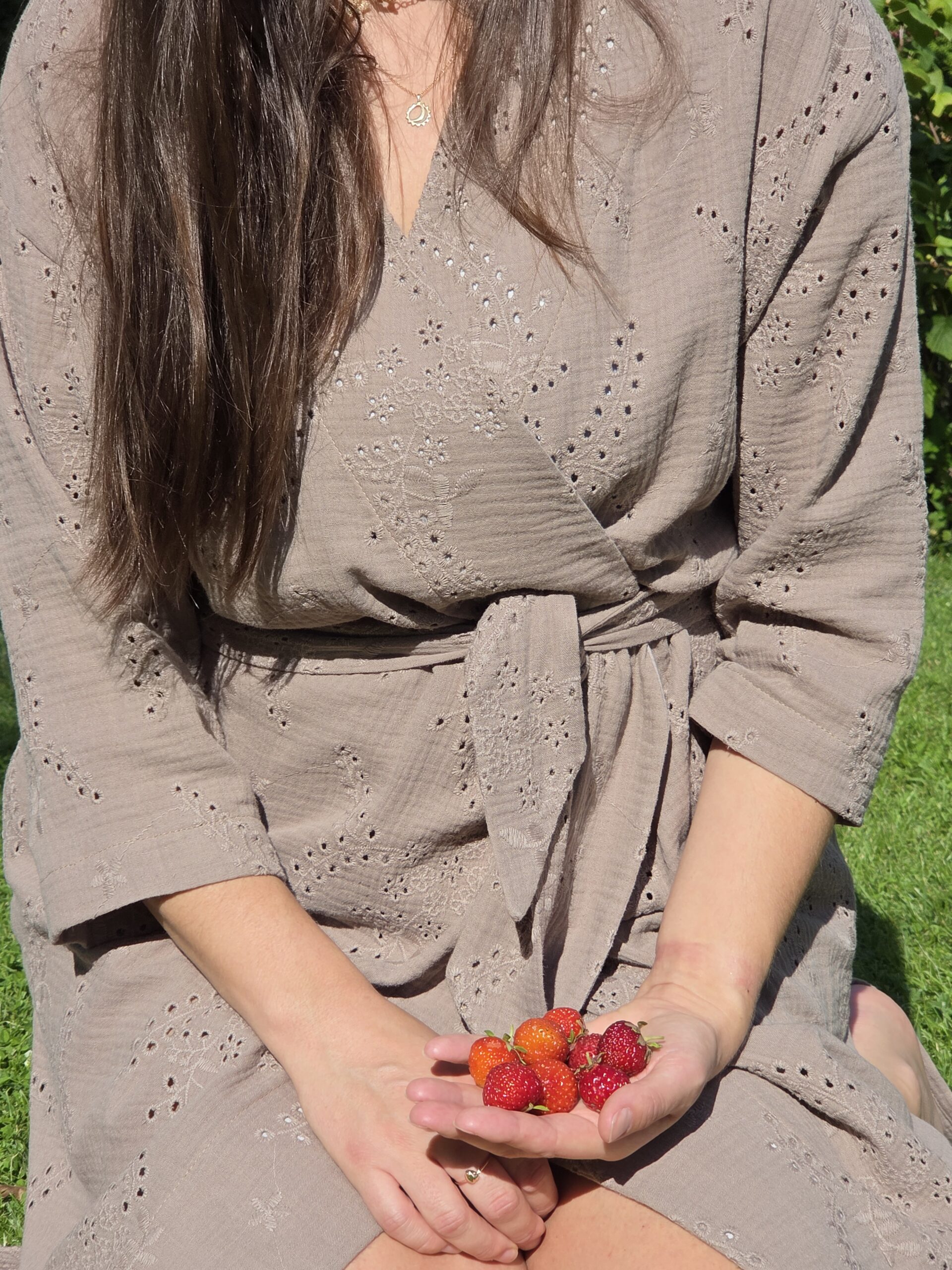 Kaunis ja pehme kimono on loodud naisele, kes hindab mugavust, ajatust ja detailides peituvat ilu. Valmistatud 100% puuvillasest musliinist – kangast, mis on nahal õrn, hingav ja kerge. Tuule käes liikuv ning kodus keha ümbritsev.