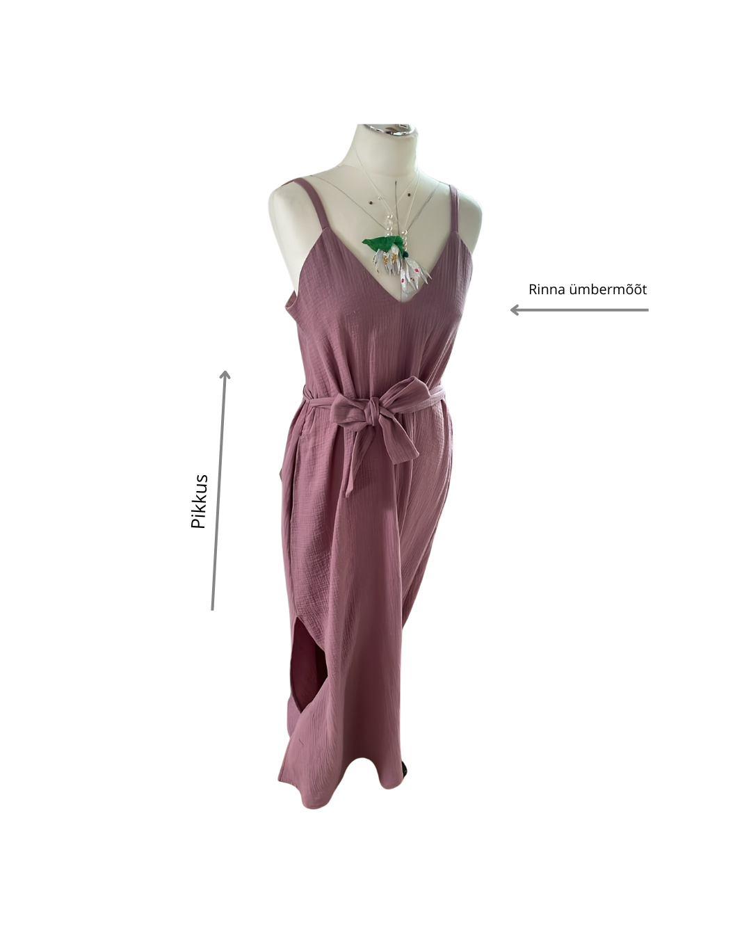 See vaba lõikega musliinkleit on loodud naisele, kes väärtustab lihtsat ilu, loomulikku liikumisvabadust ja kehaga harmoonias olevat materjali. Valmistatud 100% puuvillasest musliinist – pehmest, hingavast ja kergelt tekstuursest kangast, mis pakub ülimat kandmismugavust igal sammul.